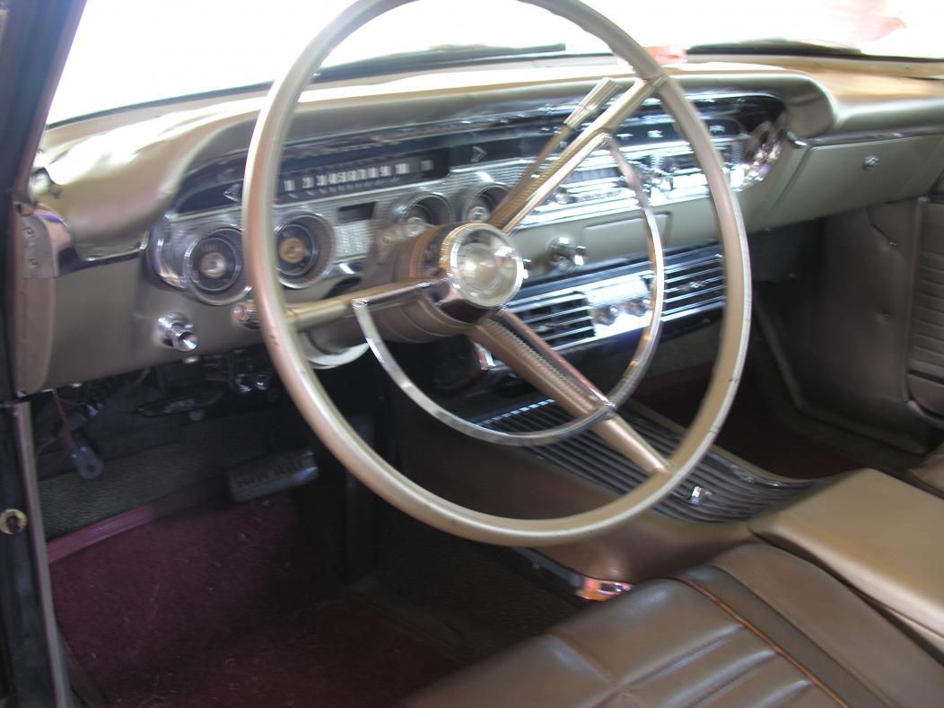 Exterior: Trunk keyhole has been replaced; spare tire in trunk; chrome has some pitting; no paint or body defects; all trim is original and intact; original hubcaps on all four white-wall tires