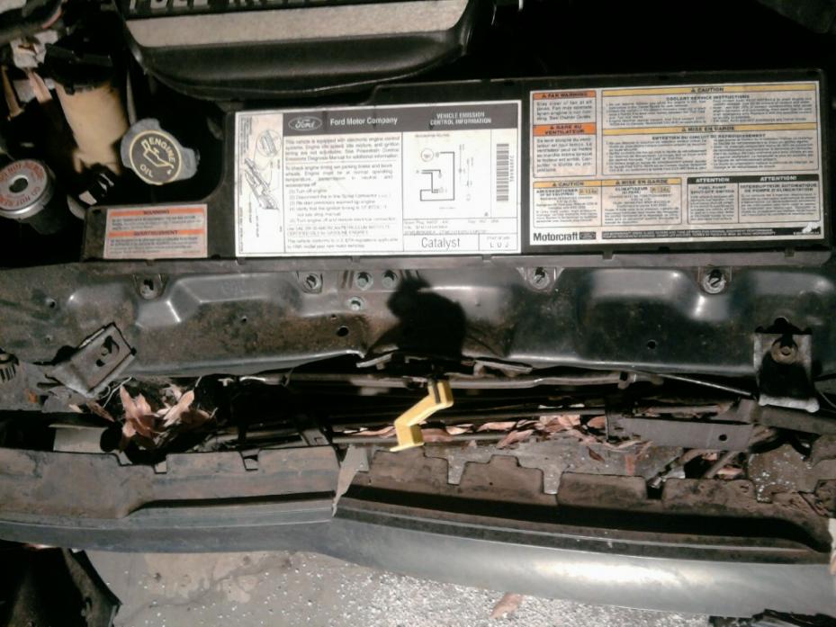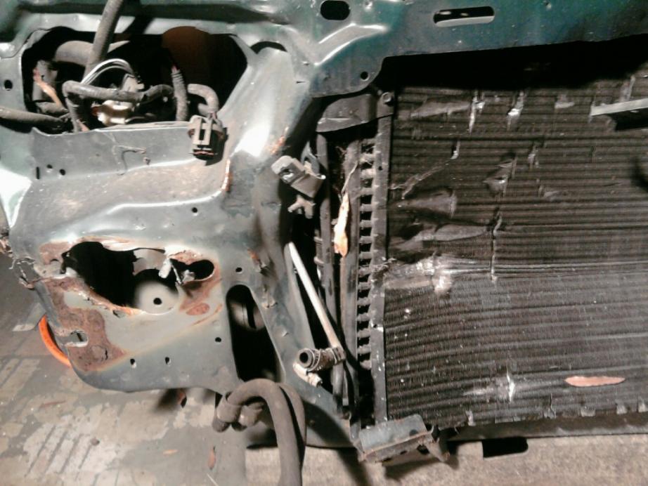 The pictures show the front end before removal. The passenger side bumper support hole and looking down on the bent cross member.